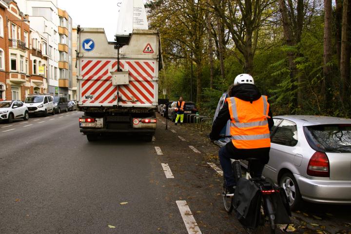 - La cohabitation sur les pistes cyclables et les interactions entre cyclistes et différents véhicules de Bruxelles-Propreté (gloutons, balayeuses, camions bulles à verre, conteneurs sur roulettes).
